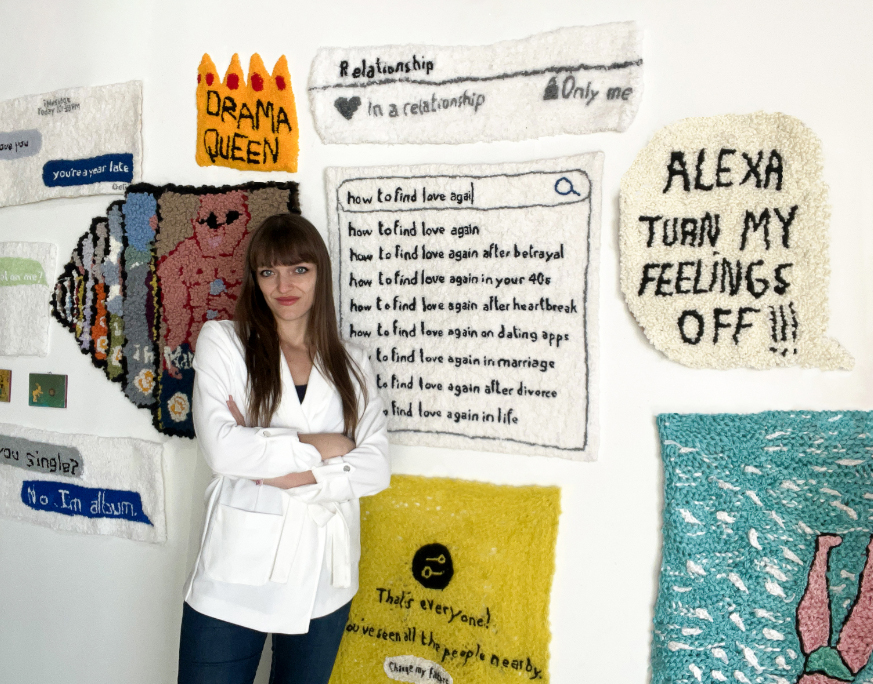 Éva Ostrowska’s work translates the immateriality of digital life into something tactile, slow, and enduringly material. From dating app interfaces to AI companion conversations, from ChatGPT breakup texts to self-marriage in the metaverse, each piece fossilizes the fleeting exchanges of contemporary love into permanent material form. Where a swipe takes a second, a tapestry takes months.